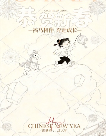 国潮插画风,拟人童趣与鎏金马匹相映,剪纸元素点缀,红金配色尽显中式喜庆,烟花灯笼烘托新春氛围。