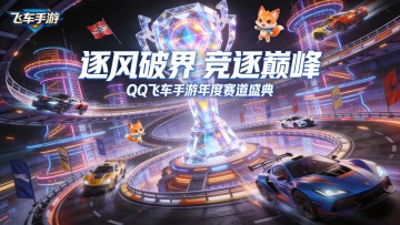 赛博朋克风与3D虚拟现实融合,霓虹灯辉映未来赛道,玻璃质感奖杯闪耀中央,赛车疾驰环绕,粒子特效迸发酷炫光影,卡通狐狸灵动飞跃,尽显科技感与热血冲击。