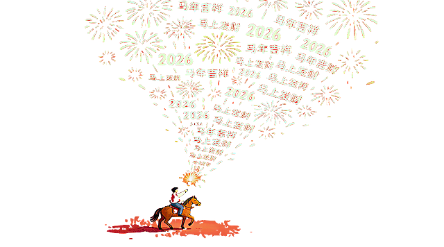 插画风国潮设计,红底烟花绽放,骑马人物手持礼花喷射“2026马年吉祥”字样,喜庆感十足,印刷质感强化节日氛围。详情