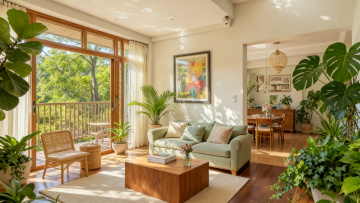 现代简约风格卧室,不同角度展示,柔和的米白色和浅木色为主色调,搭配温暖的阳光从大窗户洒入,照亮房间,白色条纹床单上随意搭着一条棕色毛毯,床头有简约的壁灯和圆形装饰摆件,窗边摆放着绿植和白色矮柜,房间内摆设包括床、床头柜、地毯、窗帘等元素,整体营造出温馨、舒适、明亮的居住氛围,干净整洁的空间布局,柔和的光影效果,细腻的材质质感,符合现代家居设计的审美。