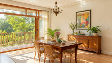极简主义风格卧室室内设计,柔和的米白色墙壁与浅橡木色木地板形成温暖和谐的基调,大尺寸窗户覆盖木质百叶帘,阳光透过百叶帘在墙面和地面投射出清晰的水平条状光影,营造出宁静舒适的氛围。房间中央放置一张低矮的原木色双人床,搭配白色床单和一条深棕色的床尾毯,床头墙悬挂一幅带细木边框的空白装饰画。床的一侧有一盆小型绿植放置在矮木架上,另一侧摆放着带有干枯树枝装饰的细长花瓶。地面铺设大块浅色毛绒地毯,天花板安装嵌入式筒灯提供均匀基础照明。整体采用简约自然的材质,线条干净利落,空间通透开阔,呈现出日式侘寂美学与现代简约设计的融合感。