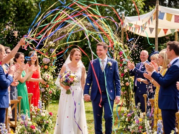 一对新婚夫妇的浪漫背影,新娘穿着优雅的白色露肩婚纱,裙摆宽大蓬松,手中捧着白色花束,新郎穿着黑色西装,温柔地从身后环抱着新娘,两人脸颊相贴,背景是一个装饰着大量白色和淡粉色玫瑰花的黑色金属拱门,周围是茂密的绿色松树和灌木丛,地面散落着花瓣,整体呈现出自然柔和的户外婚礼氛围,光线明亮柔和,色彩清新自然,构图聚焦于新人的亲密姿态与精致的婚礼场景细节。