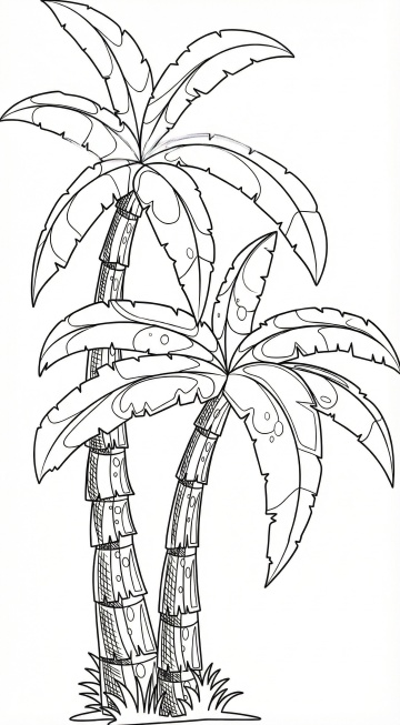 明亮的卡通风格插画,多棵高大的椰子树矗立在画面中央,树干呈棕色并带有环形纹路,顶部是茂密的绿色羽状叶片,叶片边缘有清晰的轮廓线和渐变的光影效果,树下环绕着低矮的绿色灌木丛和蕨类植物,整体色彩明快鲜亮,以蓝绿色调为主,背景是淡蓝色的天空点缀着少量白云,画面充满热带风情和童趣,构图饱满均衡,线条平滑流畅,具有明显的扁平化设计感和动画艺术特征。