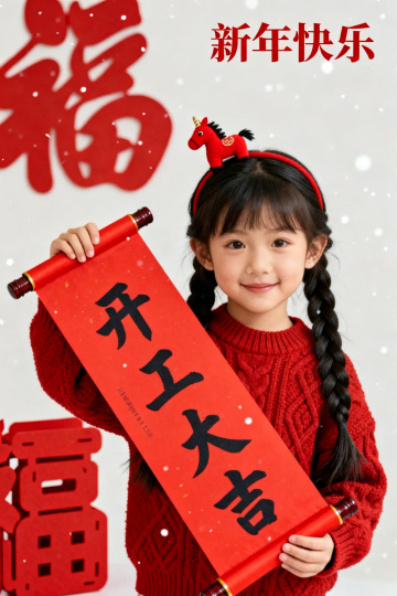国潮风剪纸元素与大字书法结合,红白对比突出喜庆感,浮雕质感“福”字与可爱童模相映,传递中式新年祝福。