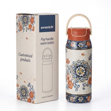 复古感中式纹样,国潮风重拟物设计,浮雕质感印刷工艺,民族风与现代实用结合的水壶包装。