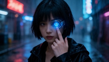 赛博朋克风格城市夜景,雨后湿润的街道反射着五彩斑斓的霓虹灯光,融合东西方建筑风格的未来都市,高耸入云的玻璃幕墙摩天大楼与传统飞檐翘角的中式建筑交相辉映,空中悬浮着全息投影广告和飞行器,两侧建筑上挂满醒目的全息霓虹招牌(展示不同的亚洲文字和英文标识),整体色调以深蓝、紫色为基底,点缀亮粉、湖蓝、明黄等霓虹光色,营造出湿润路面反射灯光的强烈光影对比和神秘迷离的未来都市氛围,场景展现一条充满未来感与传统元素碰撞的繁华商业街道,行人与自动驾驶车辆穿梭其中,充满动感与活力。