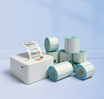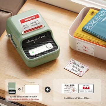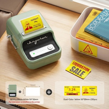 将图片中的所有中文文字替换为对应的英文:标题改为"HD Smart Label Printer","手机连接 无需油墨"改为"Connect to Mobile, No Ink Needed","300dpi高清打印"改为"300dpi HD Printing","美白精华 早晚各一次【外用】"改为"Whitening Serum, Once in the Morning and Once at Night [For External Use Only]","食用盐 开封日期:2023.3.15"改为"Edible Salt, Opening Date: 2023.3.15","客厅开关"改为"Living Room Switch","换气风扇"改为"Ventilation Fan",其余元素保持不变