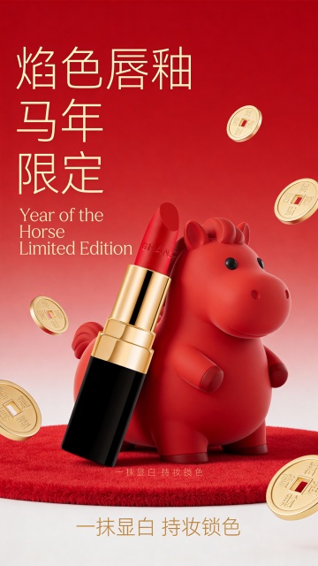 国潮风与软3D结合,红色卡通马与鎏金钱币环绕唇釉,喜庆中式感十足,节日氛围浓厚。