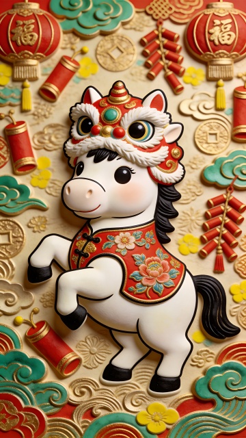 软3D粘土风小马,身着国潮刺绣红衣,头戴舞狮帽,喜庆卡通形象跃然眼前,背景浮雕祥云、灯笼与鞭炮,尽显春节欢乐氛围。