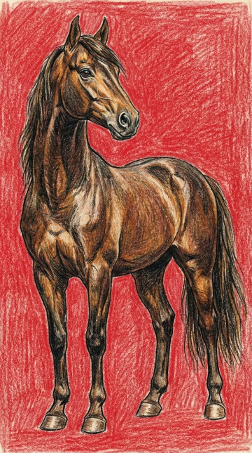 复古感与古典优雅交织,插画风马匹以单色版画手法呈现,红黑对比凸显力量与静谧,节日氛围中透出庄重与艺术张力。