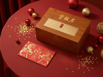 国潮风坚果礼盒,拟人化笑脸由坚果拼成,浮雕云纹点缀,喜庆红金配色,中式元素与现代创意融合,节日氛围浓厚。