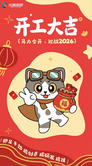 喜庆红金配色,融合国潮风与大字书法,鎏金祥云、鞭炮与红包点缀,水墨笔触呼应传统韵味,传递2026开工大吉的节日祝福。