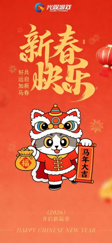 国潮风3D设计,融合中式古典元素与未来科技感,鎏金马雕饰以重拟物手法呈现,虚拟现实场景中喜庆红灯、烟花与现代城市交相辉映,传递2026马年新春的科技贺岁氛围。