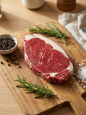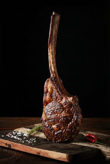 复古油画风与木雕质感结合,实景光影下呈现质朴粗犷的牛排,佐以迷迭香与粗盐,尽显节日盛宴的温暖氛围。