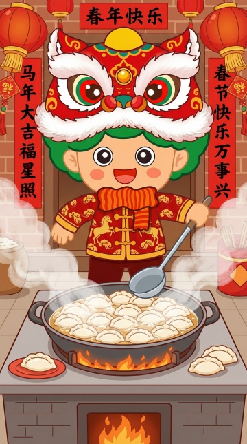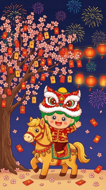国潮风插画,拟人化童子骑马舞狮,剪纸元素与鎏金点缀,喜庆红底配祥云花卉,卡通感十足,传递2026马年新春祝福。