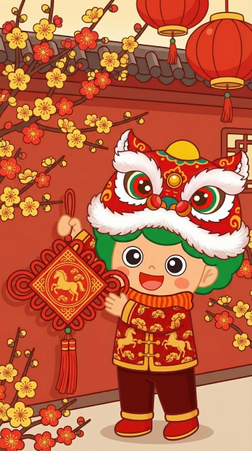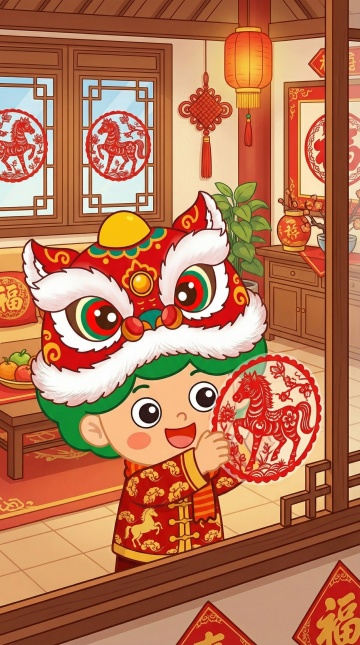 萌趣小马戴狮头,手持红灯笼,融合国潮与剪纸元素,卡通拟人设计,喜庆插画风,传递新春祝福。