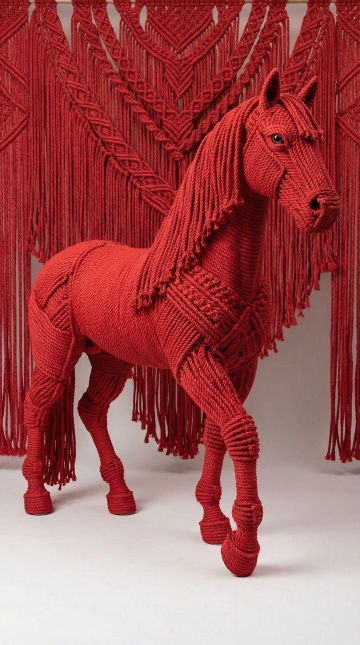 红色绳编马雕塑,融合复古与民族元素,手工编织纹理细腻,呈现质朴刺绣风与立体主义造型,单色设计强化视觉冲击,重拟物手法展现传统工艺之美。