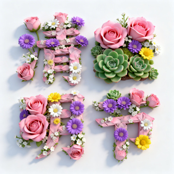 3D重拟物风字体,以玫瑰、雏菊等花卉构成“清”“明”二字,融合粘土质感与浮雕层次,呈现清新柔美、唯美的虚拟自然视觉,传递浪漫甜蜜的节日氛围。