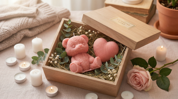 3D重拟物风木雕质感礼盒,内藏粉色小熊与心形蜡烛,搭配干花绿叶,营造温馨甜蜜的治愈系氛围,传递柔美舒适的情人节心意。