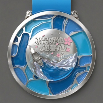 一枚高写实风格的银色奖牌,表面呈现细腻的磨砂质感与柔和的金属光泽,边缘装饰有精致的绳结纹与圆珠纹双层边框,中央为光滑的圆形区域,通过金属拉丝工艺形成细微的平行纹理,顶部连接着一条深红色的丝绒绶带,绶带边缘有自然的褶皱,整体悬挂于纯白色纯色背景上,光线从斜上方照射,在奖牌表面形成清晰的明暗交界线与柔和的阴影,突出金属的冷峻质感与立体层次。