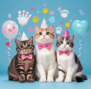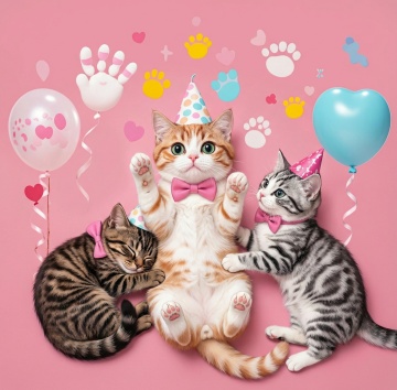 梦幻粉黑渐变背景中,三只拟人化猫咪萌趣登场,水彩质感搭配噪点细节,插画风与动漫风交融,传递甜蜜可爱氛围。