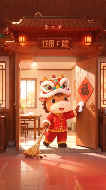 软3D卡通风格,国潮元素融合鎏金浮雕质感,喜庆红金配色,童趣人物贴春联,传递新年纳福氛围。