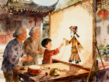 水彩插画风,清新舒适,庭院中西瓜与摇椅,夏日悠闲时光。