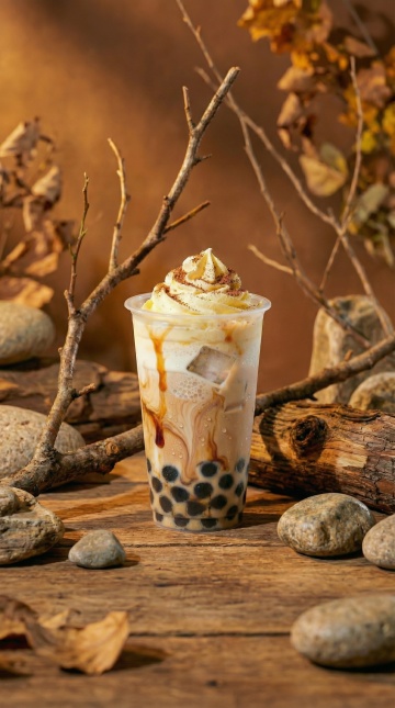 复古中式风,木质纹理与枯枝落叶营造质朴实景感,暖光晕染出温馨氛围,液态焦糖流淌如画,轻拟物设计融合木雕质感,秋日静谧诗意。