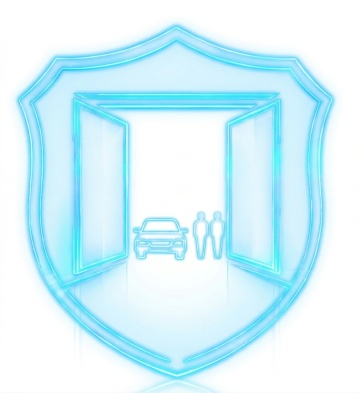未来感霓虹描边风盾牌,清透玻璃质感,科技蓝光勾勒车库与人车轮廓,象征安全守护。