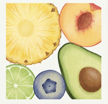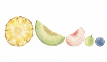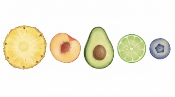 六个不同水果的水彩插画集合,保持与原图一致的清新水彩风格,包括柔和的绿色调、半透明的水彩晕染效果、细腻的笔触纹理和自然的光影表现,水果种类分别为牛油果、草莓、蓝莓、橙子、香蕉和葡萄,每个水果都以写实与艺术化结合的方式呈现,带有各自的特征细节,如草莓的种子、蓝莓的果蒂、橙子的纹理、香蕉的弧度和葡萄的串状结构,所有水果整齐排列在纯白色纯色背景上,构图平衡且具有统一的视觉美感,整体设计简洁明快,适合作为系列素材使用。