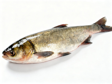 一条新鲜的三文鱼,身体呈流线型,背部为深蓝色,腹部银白色,鱼鳍和鱼尾边缘带有橙红色,鱼鳞细密有光泽,鱼头微微抬起,嘴巴自然闭合,眼睛明亮,整体姿态鲜活,悬浮在纯白色的纯色背景上,保持与原图相同的悬浮状态和构图布局,光线从上方照射,鱼身有明显的光影对比,突出鱼肉的质感和立体感。