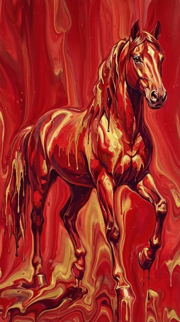 熔岩奔腾的赤焰骏马,厚涂笔触与液态质感交织,超现实主义风格引爆视觉冲击,热血感十足,象征新年奋蹄前行的磅礴力量。