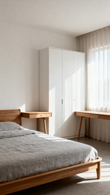 极简主义风格卧室,柔和的自然光从侧面窗户洒入,在米白色墙面上形成柔和的光影条纹,浅色木地板干净整洁,中央是铺着白色棉质床单和灰色条纹毯子的双人床,床头搭配浅灰色软包床头板,旁边是原木色小圆床头柜,上面放置透明玻璃瓶和小玻璃杯,床头柜旁有一盆绿色植物,整体氛围宁静、舒适、简约,不同角度展示卧室的布局和设置,保持相同的色调、光影和材质质感。