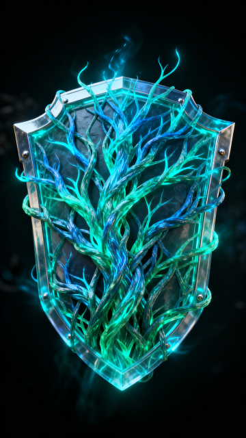 插画风国潮设计,鎏金龙纹盾牌,火焰环绕,尽显神圣与威严。