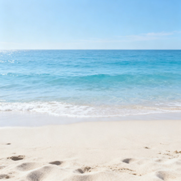 从高处俯瞰视角,纯净的浅蓝色海水,波光粼粼,海面上有白色的波浪,海浪拍打在沙滩上,溅起白色的浪花,远处是浅蓝色的天空,海天相接,画面清新、宁静、明亮,具有自然、简约的风格,色调和谐统一,光影柔和,营造出一种舒适、放松的氛围。
