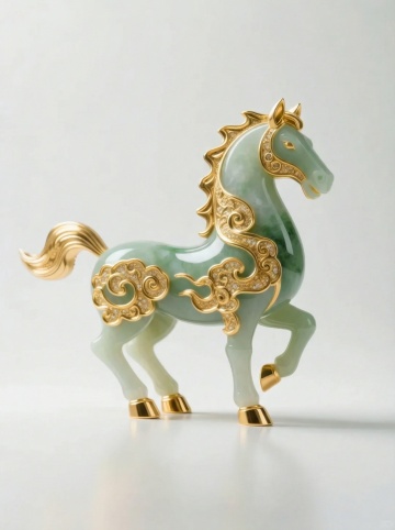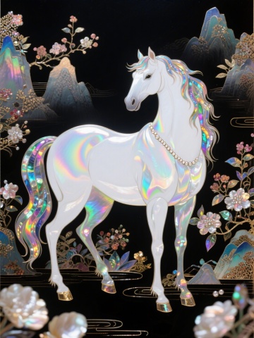 梦幻感与奢华感交织,工笔风勾勒白驹,琉璃质感鬃毛闪耀虹彩,配以鎏金山水与金属浮雕花枝,呈现中式唯美意境。