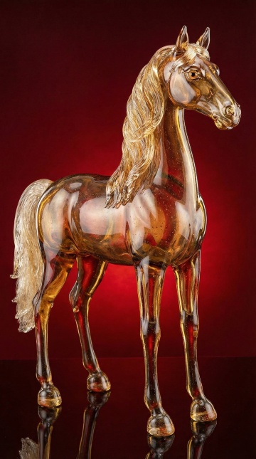 琥珀色玻璃马雕塑,融合欧洲宫廷艺术与重拟物风,光影流转间尽显奢华优雅,清透质感呼应节日庆典的华美氛围。
