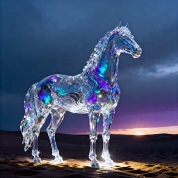 梦幻水晶马立于沙漠暮色,3D玻璃风融合液态光影,未来科技感与唯美感交织,超现实主义呈现清透优雅的虚拟现实奇景。