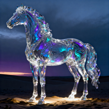 梦幻感与未来感交织的玻璃风水晶马,3D渲染呈现液态光影流动,超现实主义沙漠夜景中透出清透唯美感,科技与优雅共舞。