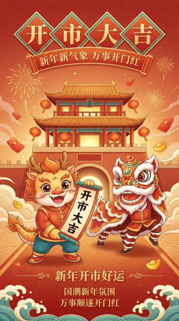 喜庆红底配软3D卡通人物,国潮风牌楼与灯笼点缀,传递龙年开市的吉祥氛围,兼具节日仪式感与现代设计美感。