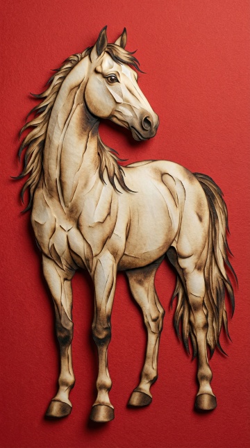 复古感与古典优雅交织,撕纸风与重拟物手法融合,浮雕质感的骏马立于红底之上,尽显唯美感与节日祥瑞气息。