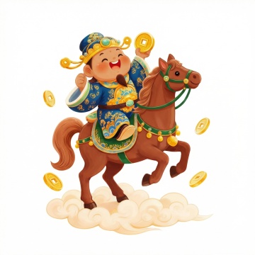 国潮风插画,拟人化财神骑金马持元宝,红金配色喜庆热烈,剪纸云纹与鎏金细节交织,卡通感十足,传递新春吉祥祝福。