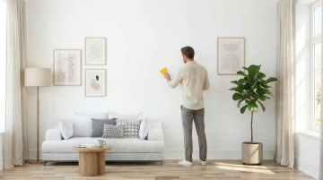 3D渲染风格室内场景,整体采用极简主义设计,主色调为纯净的米白色与柔和的浅米色,搭配低饱和度的绿色地毯和橄榄绿、暖橙色靠垫形成和谐的色彩层次。明亮的自然光从拱形窗户洒入,在墙面和地面形成清晰的光影交错效果,营造出温暖、宁静而通透的氛围。画面中包含一个米白色的模块化沙发,沙发上放置着不同颜色和材质的靠垫,沙发旁有一盆绿色植物增添生机。墙面设计简洁,一侧有垂直条纹装饰元素,地面铺设浅色木地板,整体构图遵循对称美学与三分法原则,空间感开阔,细节质感细腻,光线柔和自然,呈现出舒适、简约而富有设计感的居住环境。