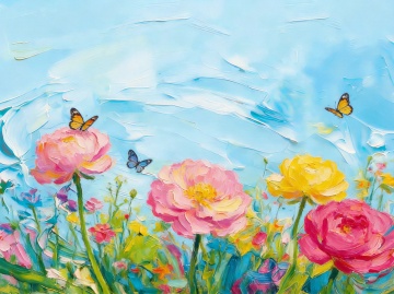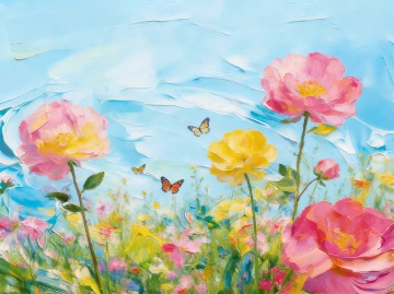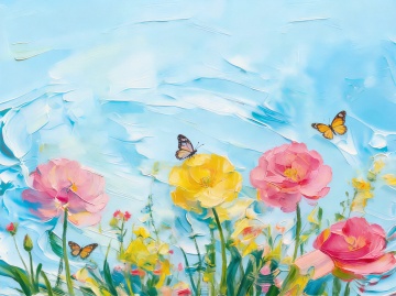水彩插画风,清新梦幻的春日景象,绿意盎然,花影婆娑。