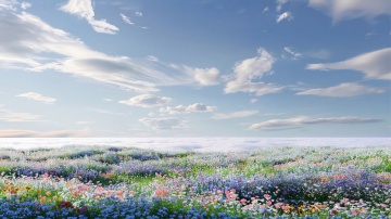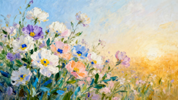 厚涂风油画,融合印象画派笔触,展现山涧花海的清新与梦幻,溪流蜿蜒,色彩斑斓,尽显自然浪漫与静谧之美。
