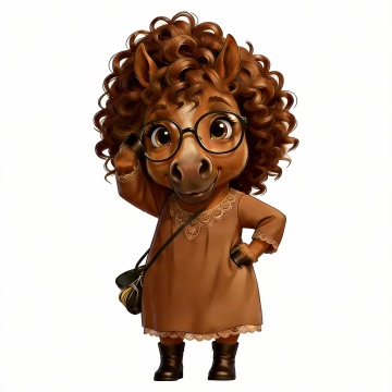 软3D风格拟人小马,卷发蓬松如云,戴圆框眼镜,穿蕾丝裙装,萌趣可爱,充满卡通感与节日欢乐氛围。 牛马人过年新愿望:健健康康 光芒万丈