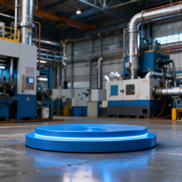 一个圆形的底座,整体呈现出半透明的浅蓝色渐变效果,边缘有一圈明亮的蓝色发光线条,散发着柔和的光晕,底座下方有淡淡的阴影,整体风格简洁现代,具有科技感和未来感,背景为纯白色。