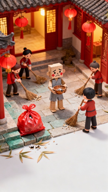 粘土风3D卡通场景,拟人化老奶奶与红马共庆春节,手持红包,温馨喜庆,细节精致,充满节日氛围。