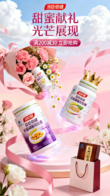 一张现代简约风格的保健品海报,主色调为清新活力的橙色与白色渐变,背景采用柔和的流线型光晕设计,营造出轻盈通透的氛围。画面中央偏右位置放置一个白色为主、橙色波浪条纹装饰的保健品罐子,罐子上印有醒目的橙色“GAODING”品牌名称。罐子周围点缀着悬浮的透明玻璃质感气泡,增强科技感与纯净感。左侧以垂直排列的橙色六边形信息框呈现产品核心卖点,包括“维生素含量高达90%”、“天然植物萃取”、“易吸收配方”、“无蔗糖无添加”等文字内容。海报顶部中央位置为品牌名称“DANBAIFEN”,其下方是大号加粗的核心宣传语“补充维生素活力”,整体视觉层次分明,信息传达高效,符合健康保健产品的专业形象与清新调性。