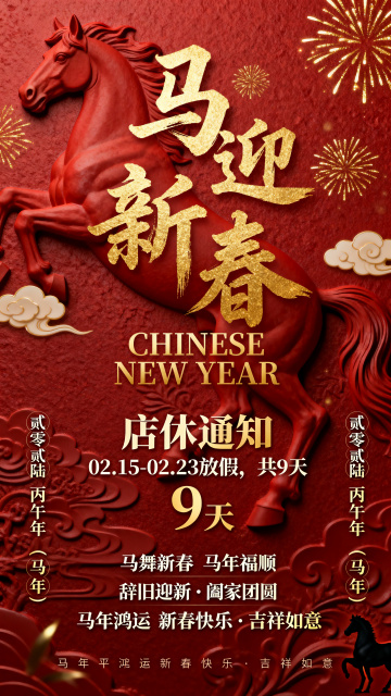 喜庆红金配色,中式浮雕马造型结合鎏金书法,重拟物风呈现国潮质感,烟花祥云点缀,传递马年新春的吉祥氛围。